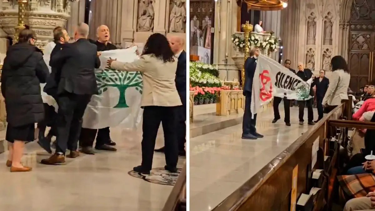 Nueva York, Nueva York, 01 de abril de 2024. La interrupción de la misa de Pascua en la catedral San Patricio de Nueva York por parte de tres hombres que desplegaron una pancarta con el mensaje "Silencio = Muerte" ha generado controversia y atención mediática. El grupo Extintion Rebellion NYC (XR NYC), que organizó la protesta, se define como activista en defensa del medio ambiente y en contra del genocidio.